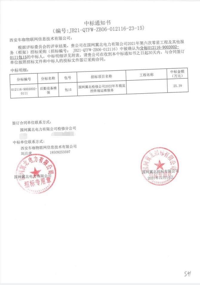 中标喜讯|我司中标国网冀北电力有限公司2021年第六次零星工程及其他服务(框架)招标采购项目 在国网冀北电力有限公司2021年第六次零星工程及其他服务(框架)招标采购项目中,我司中标国网冀北检修公司2022年车载终端运维服务。